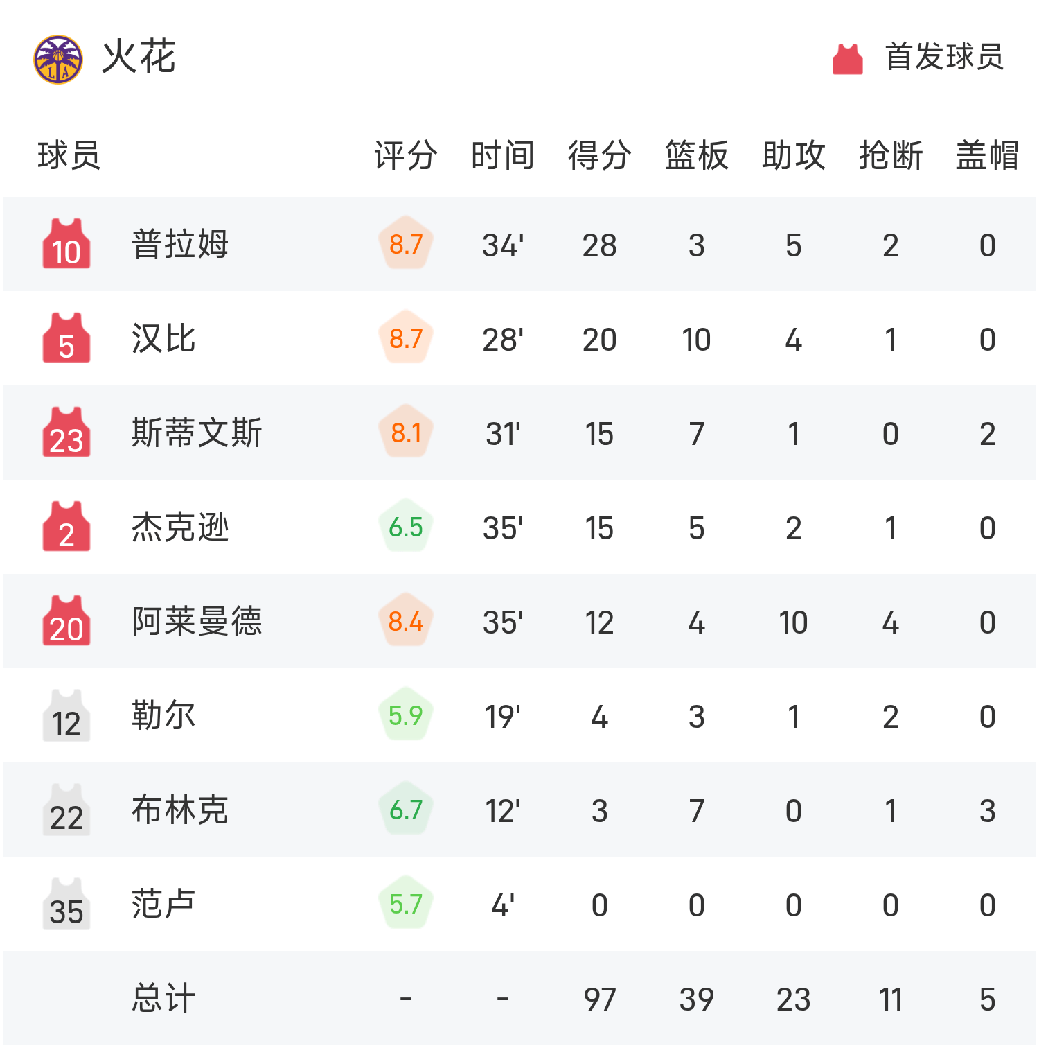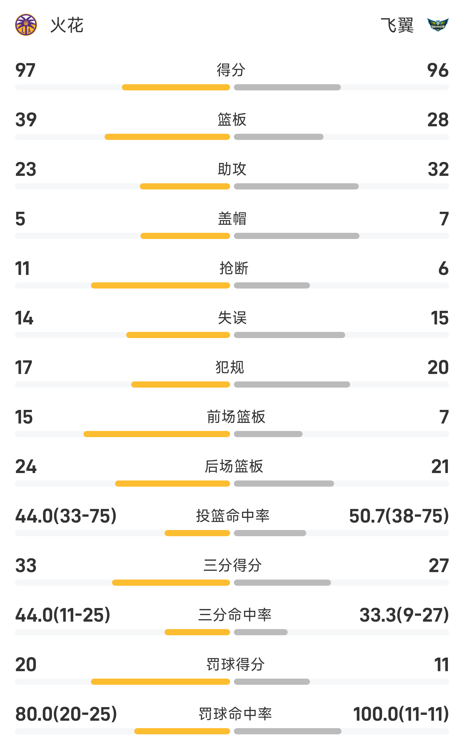 文章目录 [+] 08月16日讯 25赛季WNBA常规赛,飞翼对阵火花。双方全场战罢,飞翼96-97不敌火花。普拉姆得到28分2板5助率队取胜,佩奇空砍全场最高的29分4板5助。球员数据 查看更多详细数据 查看更多