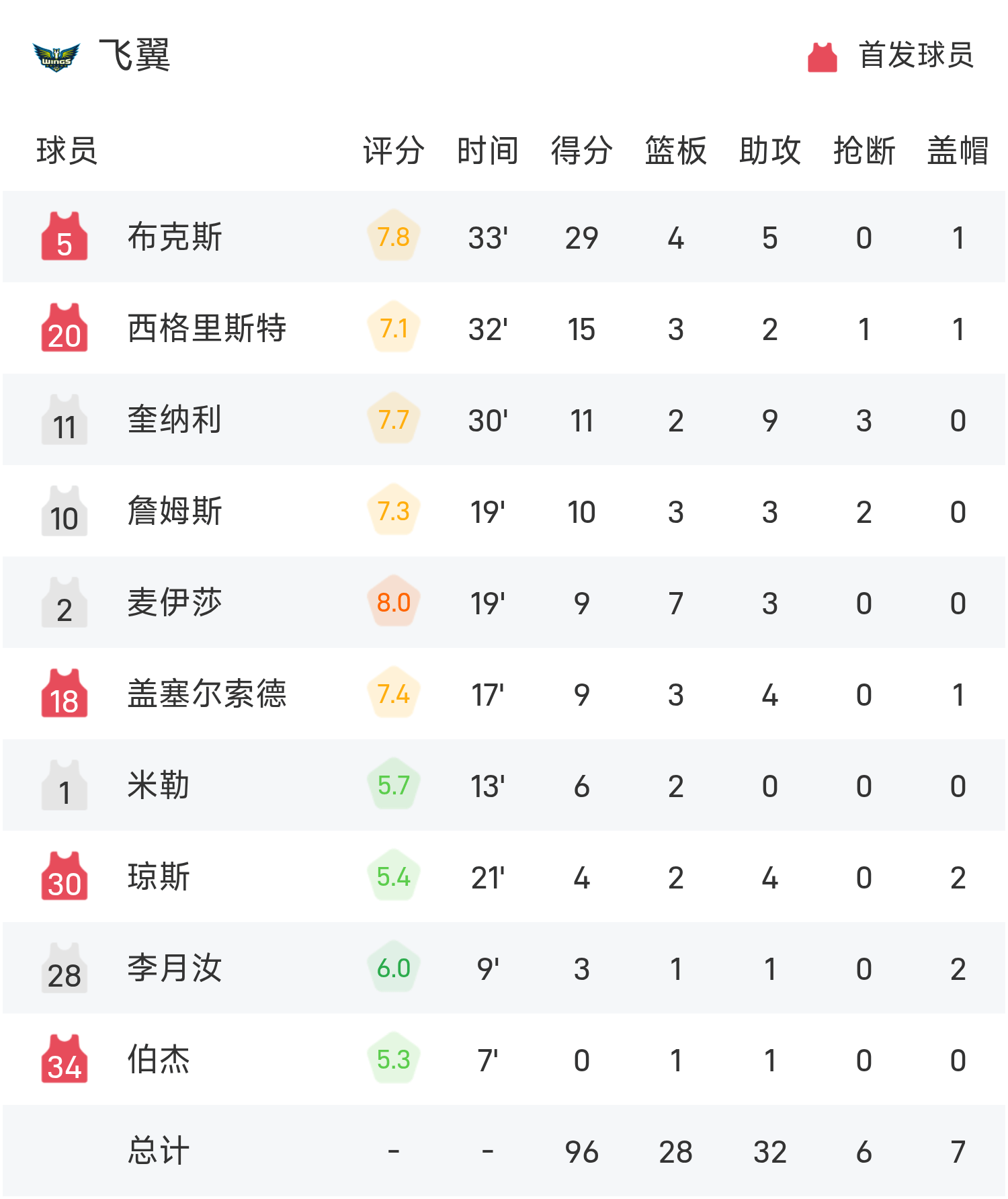 文章目录 [+] 08月16日讯 25赛季WNBA常规赛,飞翼对阵火花。双方全场战罢,飞翼96-97不敌火花。普拉姆得到28分2板5助率队取胜,佩奇空砍全场最高的29分4板5助。球员数据 查看更多详细数据 查看更多